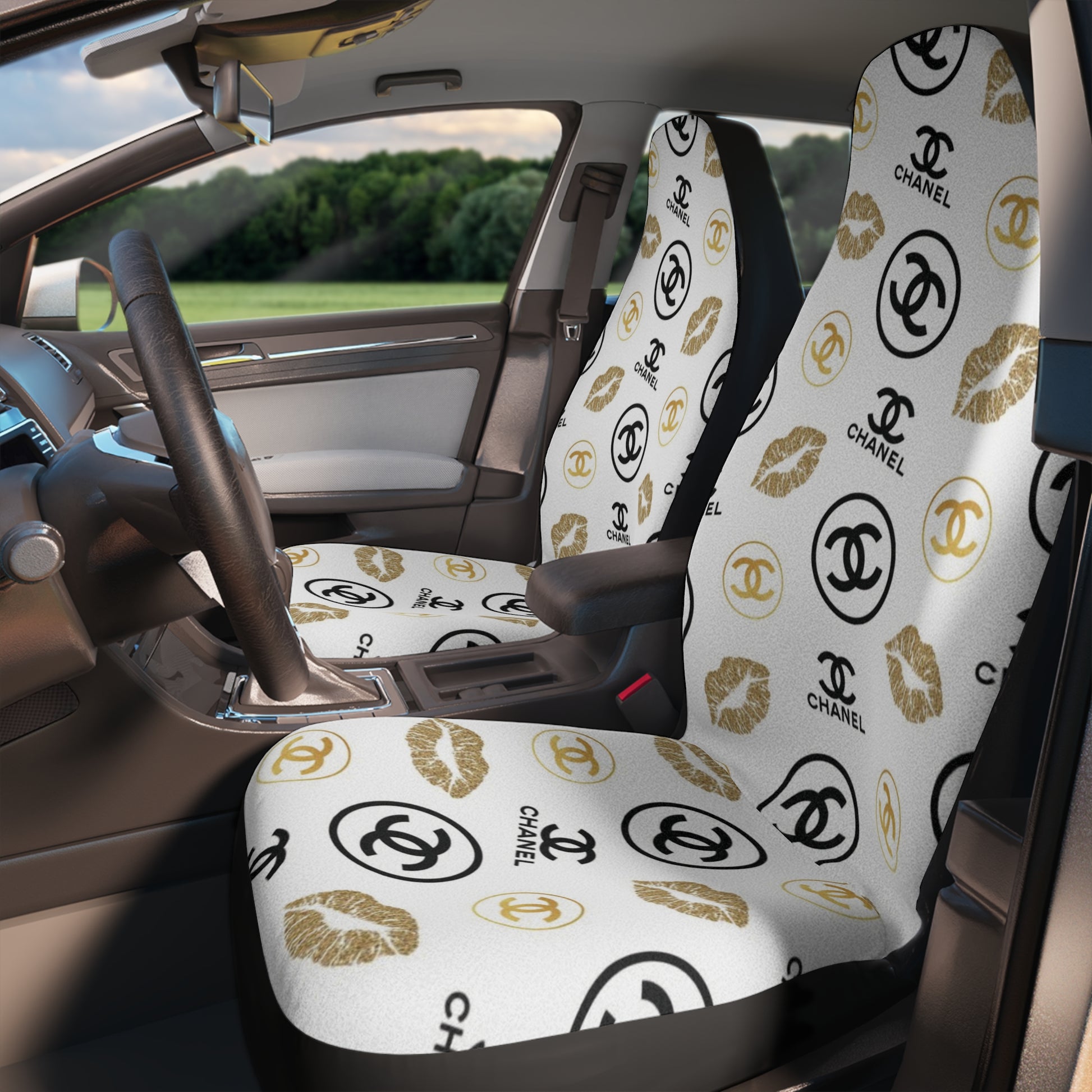 Transform your vehicle into a statement of sophistication with the Chanel Gold Kisses Car Seat Covers, where elegance and luxury meets comfort and style.